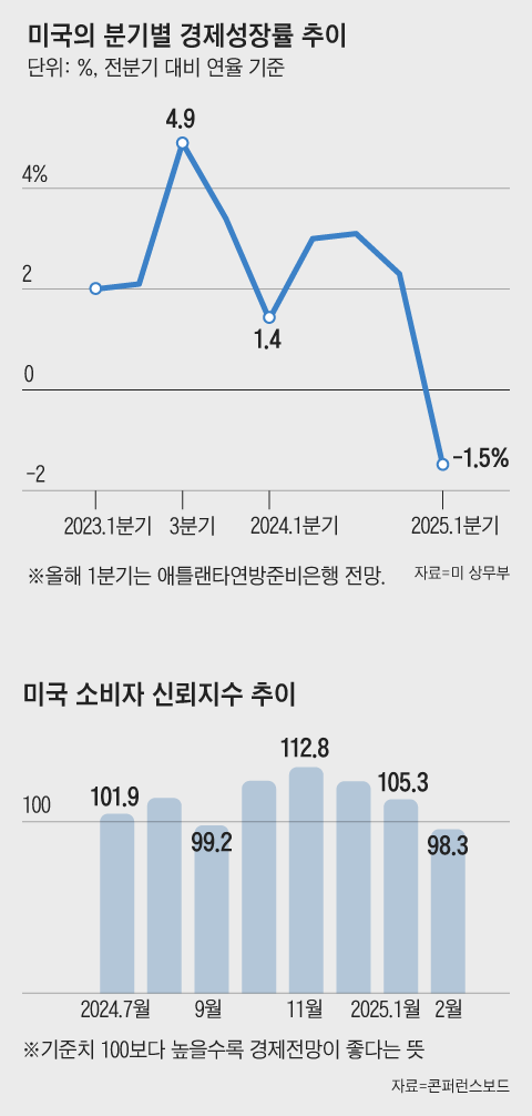 미국 경제가 2025년 1분기(1~3월) 마이너스 성장(-1.5%)할 것이라는 전망이 제기됐다. 애틀랜타 연방준비은행(GDP나우)은 기존 2.3% 성장 전망에서 -1.5%로 대폭 하향 조정했다.